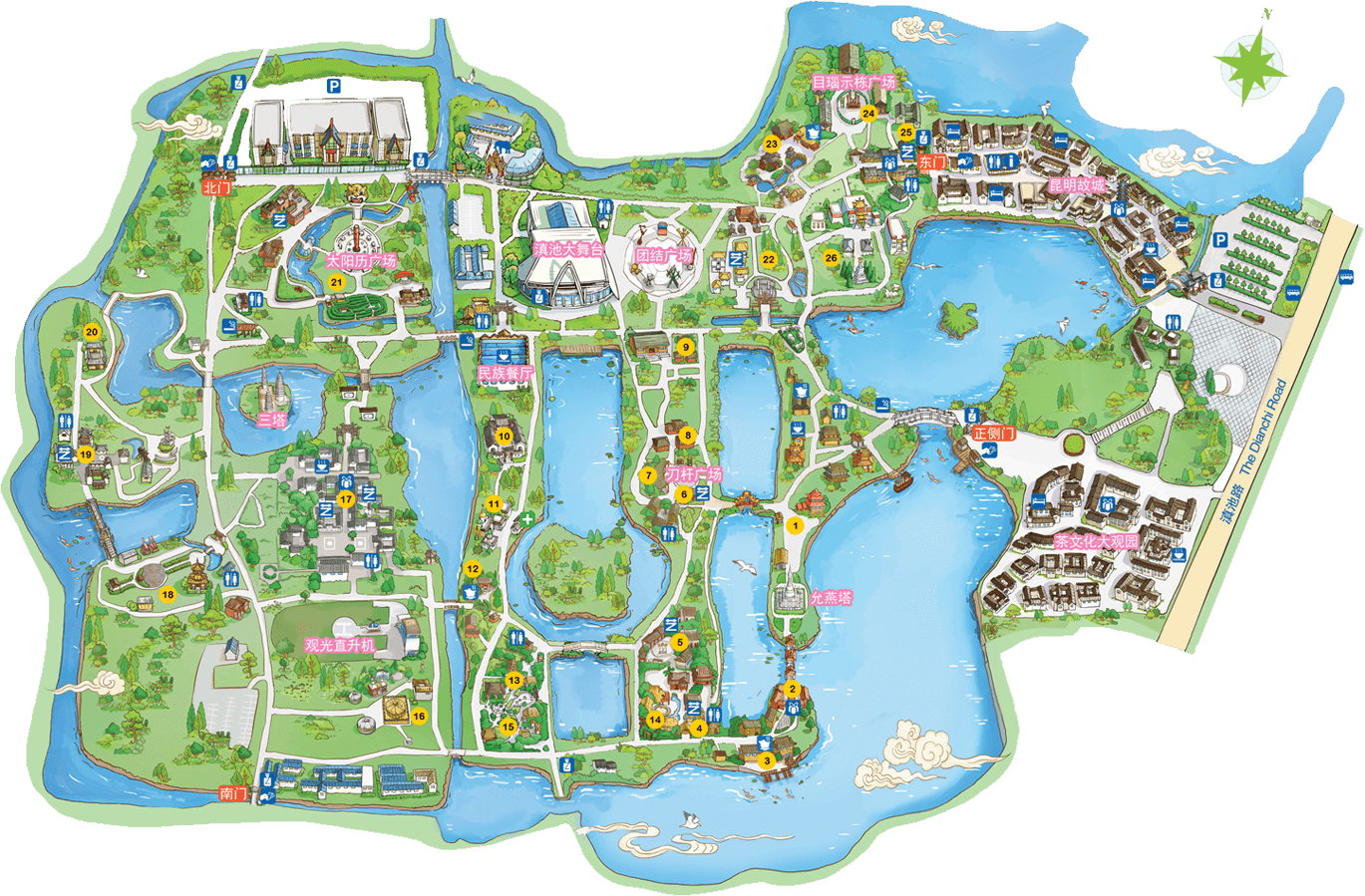 佤族人口約36萬,主要聚居在云南省瀾滄江南段以西的阿佤山區(qū)。佤族寨位于“翠漪洲”東南角。寨內分布有茅草頂?shù)母蓹谑浇ㄖ?、牛頭廣場、神靈廣場、司崗里石雕以及糧倉等。牛頭廣場是佤族古老的剽?;顒訄鏊瑘稣械呐=菫樨糇宓恼瘶?,廣場前的兩個石人分別為佤族的男性和女性祖先。神靈廣場表現(xiàn)了佤族萬物有靈、靈魂不死的自然崇拜觀念。場中兩個石人雕像分別為佤族最崇拜的“木依吉”和“阿依娥”。佤族木鼓舞節(jié)拍鮮明強烈,...